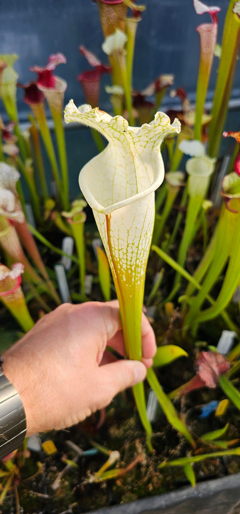 Sarracenia Leucophylla alba SL11, white form, GH 2005